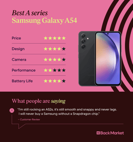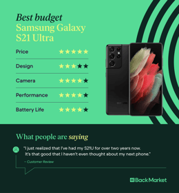 When looking for the best midrange Samsung phone on the market, consider this: the Samsung Galaxy S21 Ultra (professionally refurbished prices starting from €289) is over 3 years old, yet it still gives newer phones a run for their money. In 2021, this device was Samsung’s flagship phone. Thanks to price drops, it’s one of the best smartphones you can buy for a relatively low price. With a 4,000 milliampere-hour (mAh) battery and a dynamic screen refresh rate that adjusts to on-screen content, the S21 Ultra is a powerhouse machine. Its bulky frame can be off-putting to some, and the iPhone Pro Max 12 just barely edges out its price tag. Regardless, the Galaxy S21 Ultra is the best budget Samsung phone per dollar.