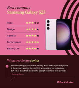 It’s no surprise that the Samsung Galaxy S23 (professionally refurbished prices starting from 263 €) earns this spot on our list. Even though it’s the base model of the S23 line, it still possesses many of the same features that make its older siblings great. The S23 wins out on its size and price tag relative to the other S23 models.